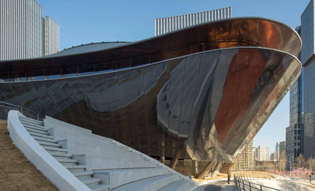 这种带有金属质感镜面涂层的ETFE膜材具备不凡历久性与奇妙光学特质,在日光照耀下,建筑能了了反射附进绿树浓荫与泄漏太空,视觉上终了大幅“消隐”。走近了细看,膜面模糊透着内部设立的综合,朦抵赖胧。