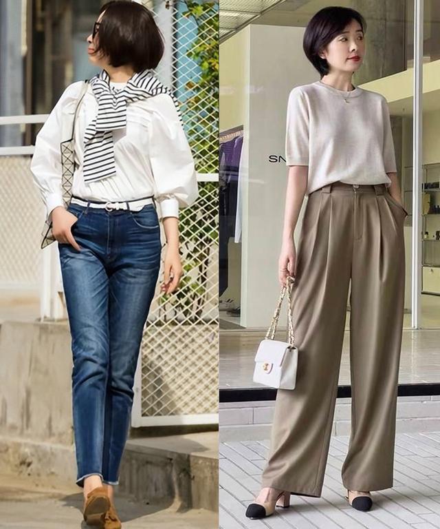 其次是裤腿松紧度,切忌太松或太紧,以直筒、宽腿、阔腿裤型为主,包存身段、修饰腿型,上身成果显得优雅又大气,还能守秘各式腿型问题。