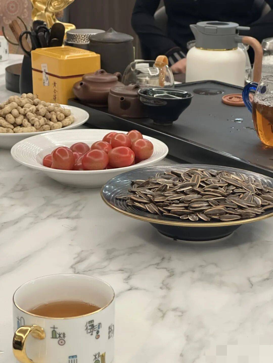 当今透顶戒了烟酒,全程就喝杯茶,桌上摆的圣女果、花生瓜子,一口皆没动,就专心跟人人唠嗑。