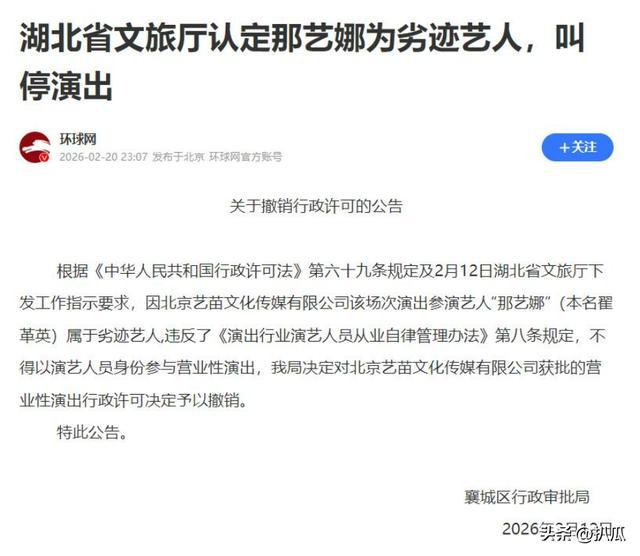 2026年2月12日,湖北省文旅厅厚爱将那艺娜定性为劣迹艺东说念主,她的“群星演唱会”也被官方紧迫叫停,且必须退票!