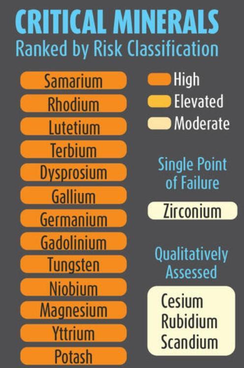 风险等第最高的关键矿产有13种,其中排在前五位的阔别是钐、铑、镥、铽、镝等稀土元素。