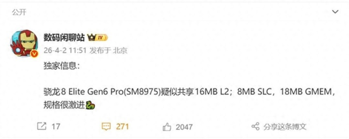 高通新一代旗舰挪动平台骁龙8E6 Pro(里面型号SM8975)运筹帷幄于本年9月发布。四肢高通全新迭代的旗舰芯片,其在缓存、工艺、图形性能等中枢维度齐备全认识升级,不仅创下高通手机芯片缓存新记载,更预示着安卓挪动端的性能竞争将跨入全新量级。