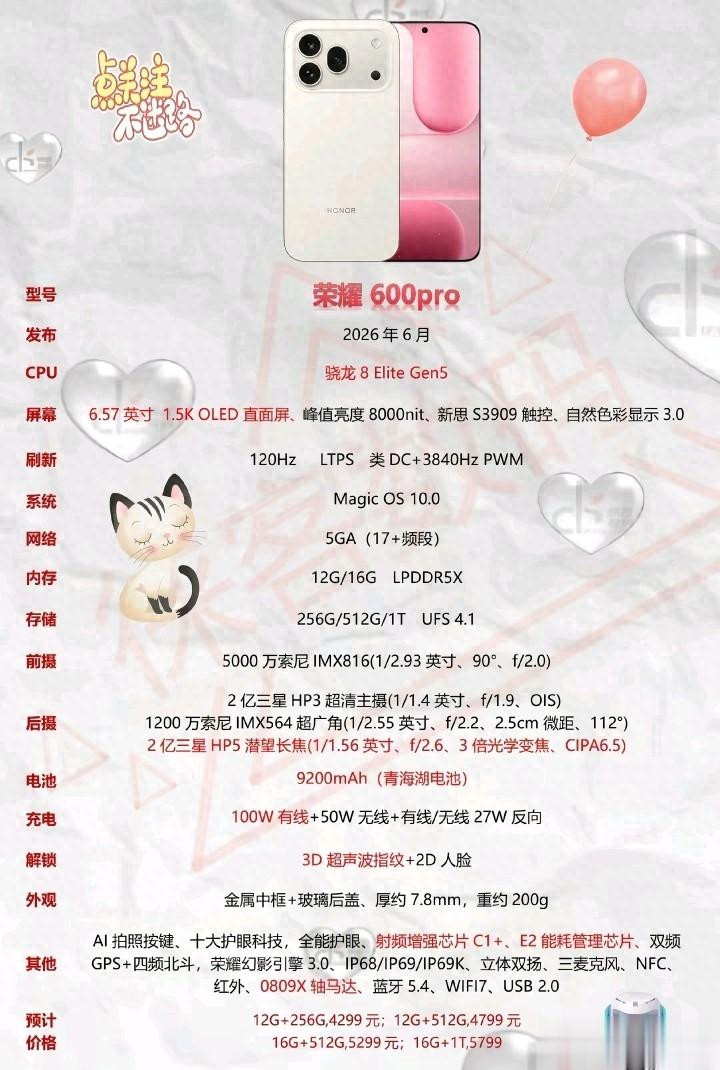 2026年4月荣耀600系列实在立参数与外不雅蓄意已全面曝光。这一系列手机凭借庞大的硬件规格和全新的影像系统。眩惑了繁密猝然者的温雅。荣耀600系列包括要领版和Pro版。两款机型在中枢确立上有所辩认。但皆体现了荣耀在中高端市集的时刻实力。Pro版搭载了骁龙8 Elite Gen5旗舰芯片。合作LPDDR5X内存和UFS 4.0存储。确保了运动的多任务处理和高速数据读写材干。要领版则接收骁龙7 Gen4芯片。相通具备出色的能效进展。合乎日常使用和轻度游戏需求。屏幕方面。两款机型均配备6.57英寸1.5K OLED直屏。维持120Hz刷新率和3840Hz高频PWM调光。在保证视觉运动度的同期。也兼顾了护眼成果。峰值亮度达到8000nit。即使在强光下也能明晰浮现现实。