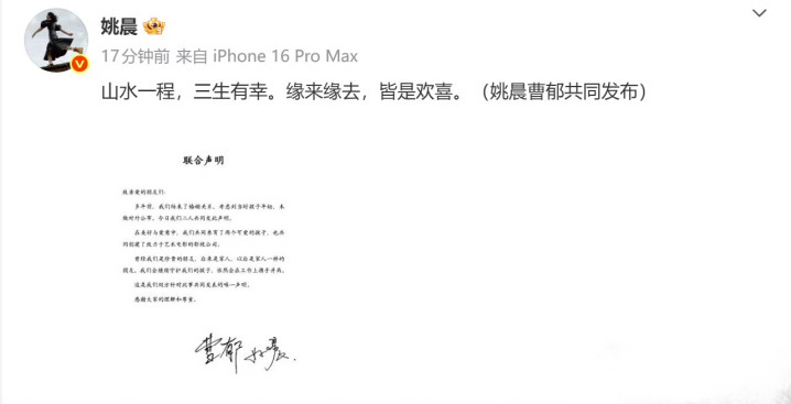 文娱圈再次传来令东说念主唏嘘的音信,驰名演员姚晨与驰名照相师曹郁致密发布聚首声明,官宣司法婚配干系。这份迟来的声明,莫得撕扯与责问,独一和煦与体面,字里行间显现出两东说念主对过往的珍贵和对将来的厚重。姚晨在个东说念主外交平台发文:“山水一程,三生有幸。缘来缘去,都是欢快。”短短数语,说念尽了一段花样的起落与释然。