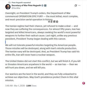 在炸死伊朗最高首领哈梅内伊后,在好意思国战争部长赫格塞斯3月1日在社媒平台上发文教化:“若是你像伊朗那样活着界任何场地杀害或威逼好意思国东说念主,咱们就会追捕你,并杀了你。”