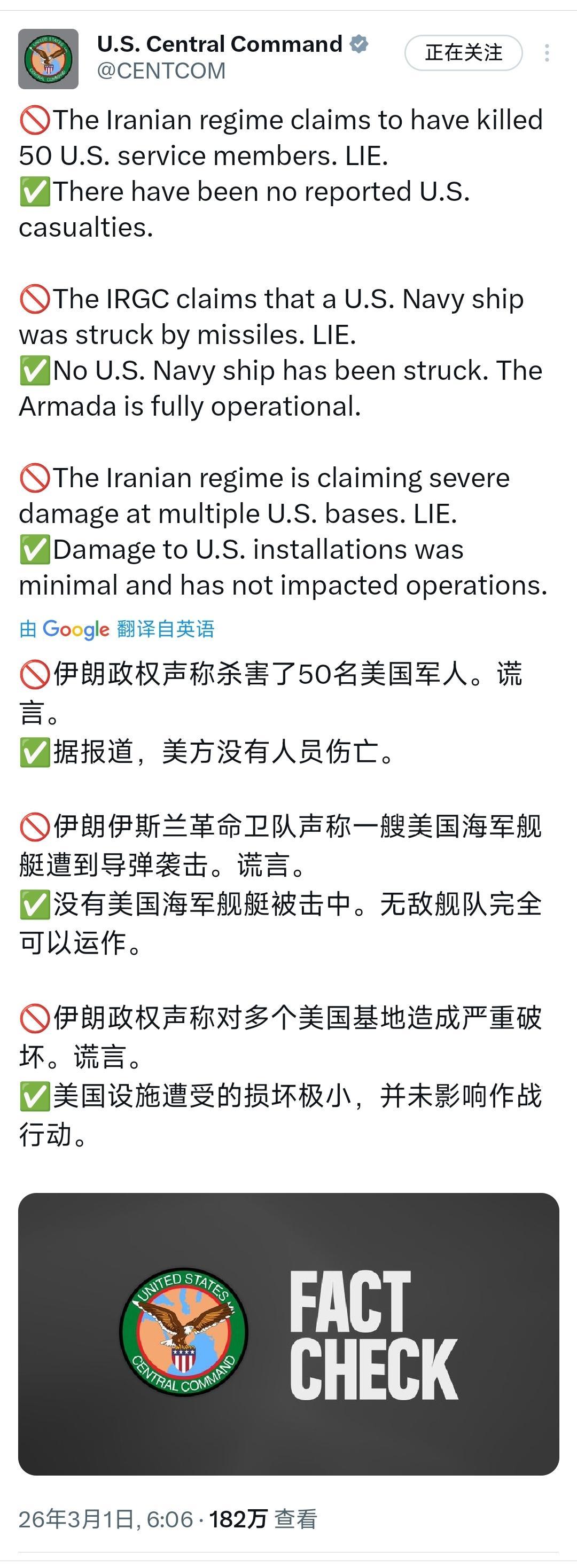 【伊朗的症结,到底有莫得形成好意思军的战损?】好意思国中央司令部3月1日发文写说念: