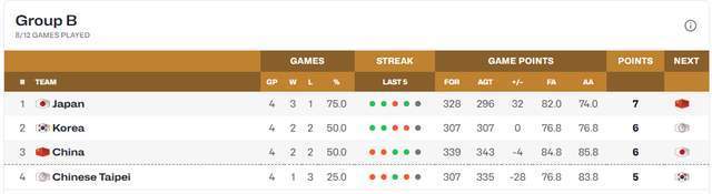 第二窗口期2场比赛打完,刻下B组积分榜有了新变化。日本队3胜1负稳居第一,韩国队2胜2负积6分,中国男篮不异2胜2负,却因交锋战绩0-2过时韩国,只可排在第3。