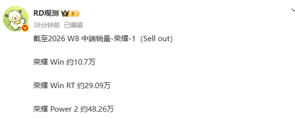 【CNMO科技音书】3月2日,CNMO真贵到,博主“RD不雅测”曝光了几款荣耀10000mAh超大电板手机的最新销量数据:范畴2026年第8周,荣耀WIN机型销量约10.7万部,荣耀WIN RT机型销量达29.09万部,而1月5日发布的荣耀Power2机型以48.26万部的收成领跑三款机型。三款机型总销量达88.05万部,接近90万部大关。