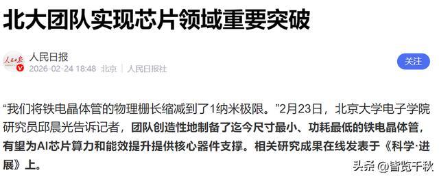 2026年2月,北京大学电子学院邱曙光团队甩出一张王炸,将铁电晶体管的物理栅长缩减到了1纳米极限。